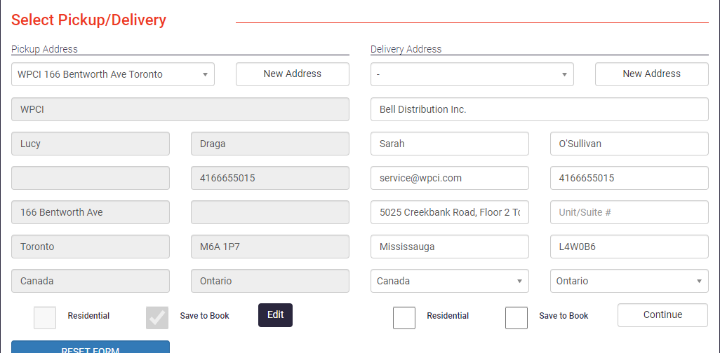 For the pickup address, you can select WPCI from the drop down list. For the delivery address you will need to enter all the information. Once everything has been filled out click on ‘Continue’.