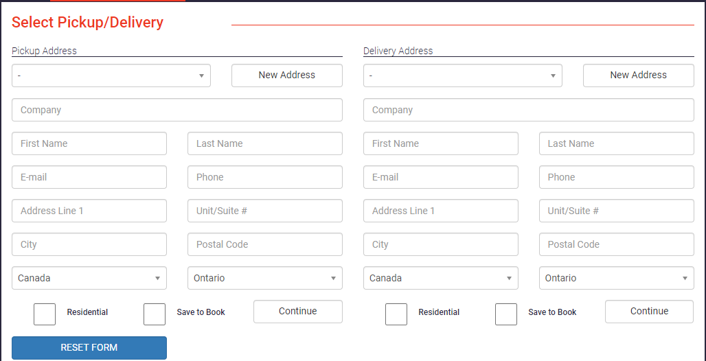 Once you login, you will be taken right into the order placing screen. You will need to fill out both the sections including the Pickup Address and Delivery Address.