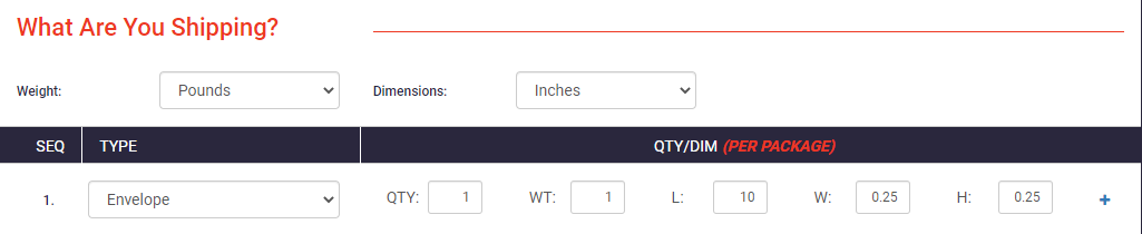 In the What Are you Shipping? section select the TYPE of package you will be using (Envelope, Box etc). For quantity enter 1 if its 1 package and for weight enter in pounds.