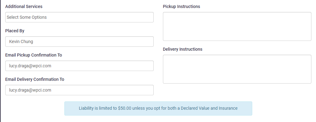 In the additional detail section, enter your name in the ‘Placed By’ section.You will also need to enter the email confirmation field both for Pickup and Delivery. An email notification is sent to these addresses both when the package is picked up and then delivered.