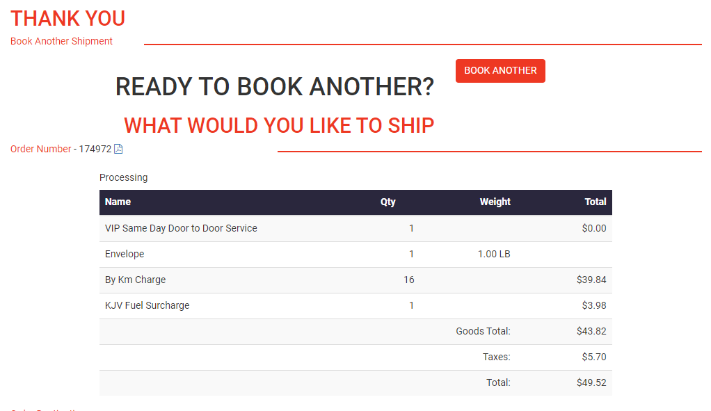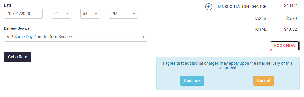Once all the information has been entered. Click on ‘Get a Rate’. You will be presented with the charge to same day this package to the specified address. If you are satisfied with everything click on ‘Book Now’ to schedule the delivery. You will need to click on ‘Continue’ after to confirm the selection.