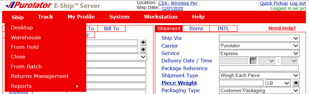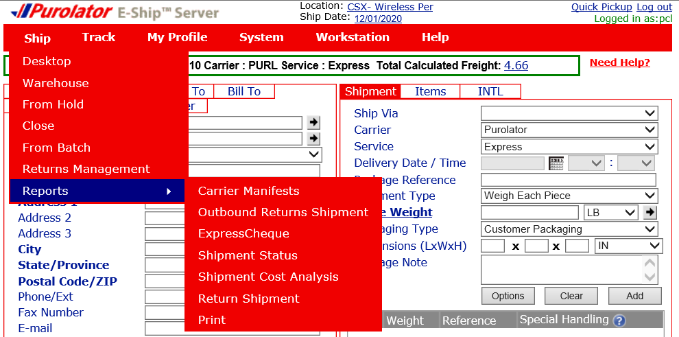 After the PDF file has been saved you will now need to upload the manifest to the Purolator server. To close/upload the manifest click on ‘Ship’ and select ‘Close’.