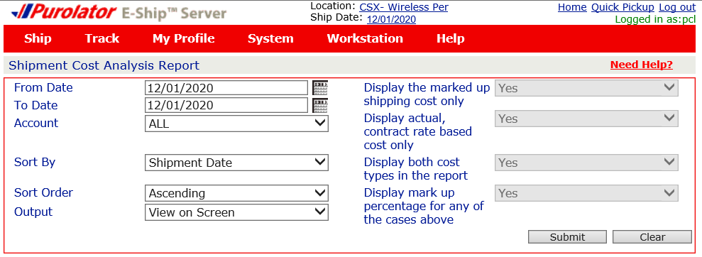 Once you are in the Shipment Cost Analysis Report screen, the only thing you will need to change is the date. Generally this is done daily so you will change the From/To date to today’s date. Once that has been done click on ‘Submit’.