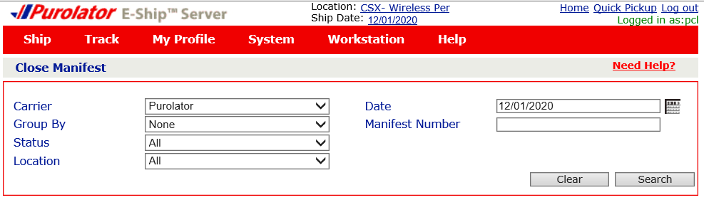 From the Close Manifest page click on ‘Search’. You are not required to change anything on this page. Just ensure the date is correct.