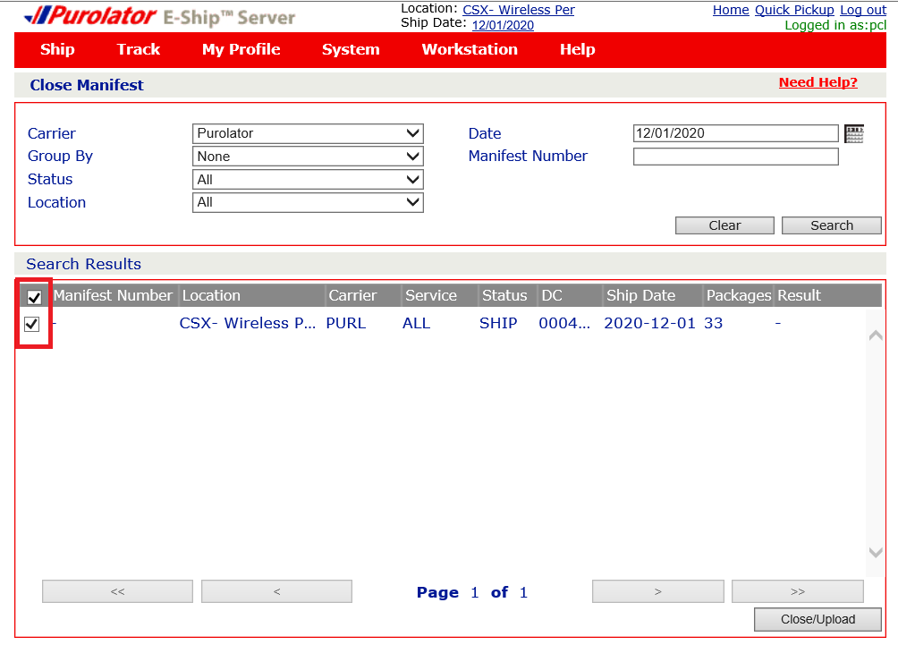 Once the page has loaded, it will display how many packages you shipped for the day. Click on the check boxes on the left hand side of the screen and click on ‘Close/Upload’.